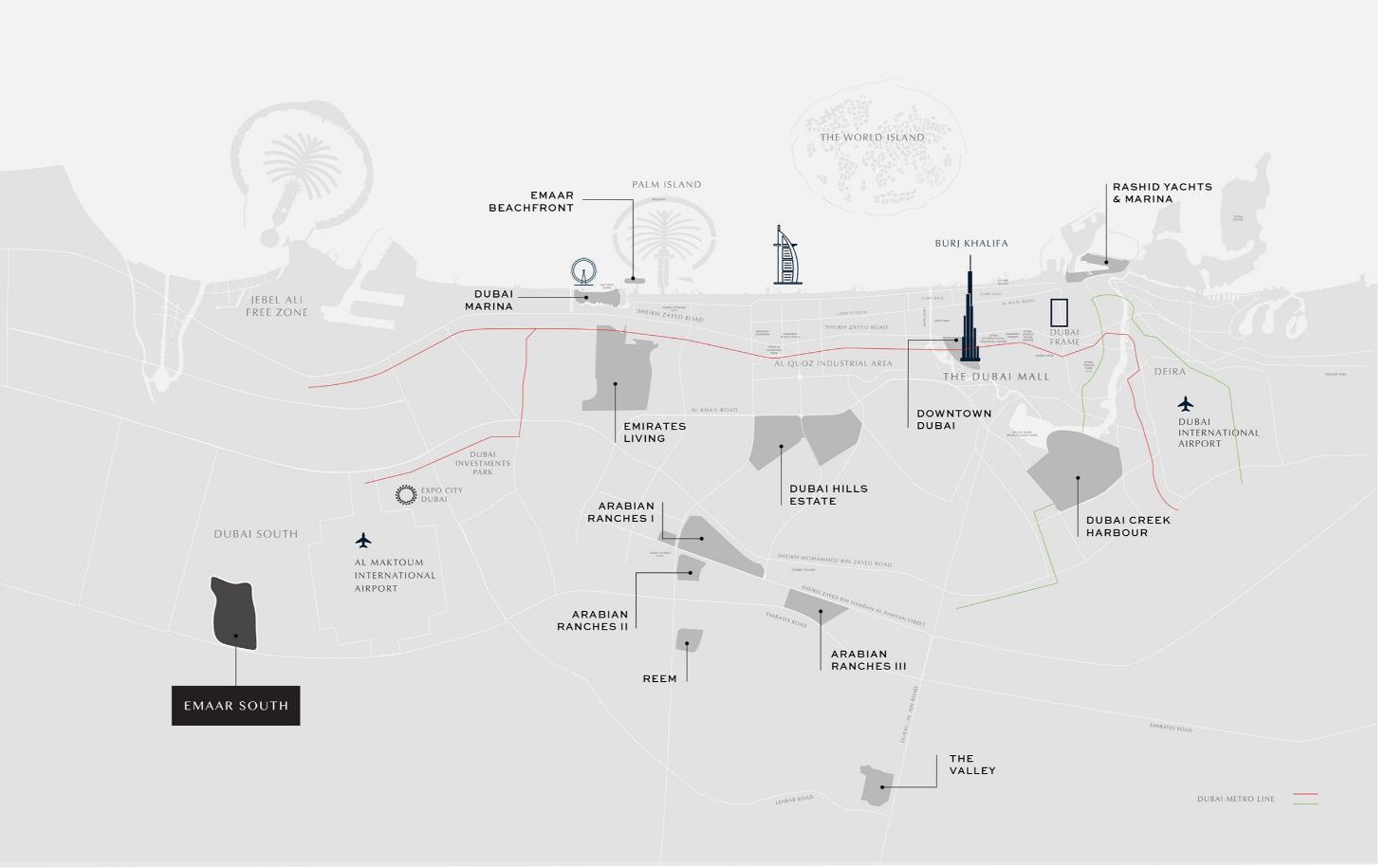 Perfectly positioned in the vibrant Emaar South, Greenridge is strategically located alongside Expo City Dubai, offering residents easy access to Al Maktoum International Airport and Dubai’s key attractions and business hubs. The development is just a 7-minute drive from Al Maktoum International Airport, 10 minutes from Expo City Dubai, 20 minutes from Dubai Marina, and 30 minutes from Downtown Dubai. This prime location provides residents with a seamless connection to the city while enjoying a peaceful, nature-inspired environment.